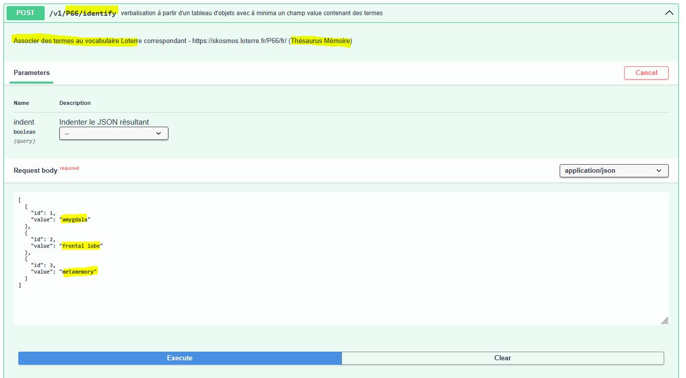 Un service d’accès par API aux données du triplestore de Loterre est disponible, par le biais de l’API REST développée pour Skosmos :